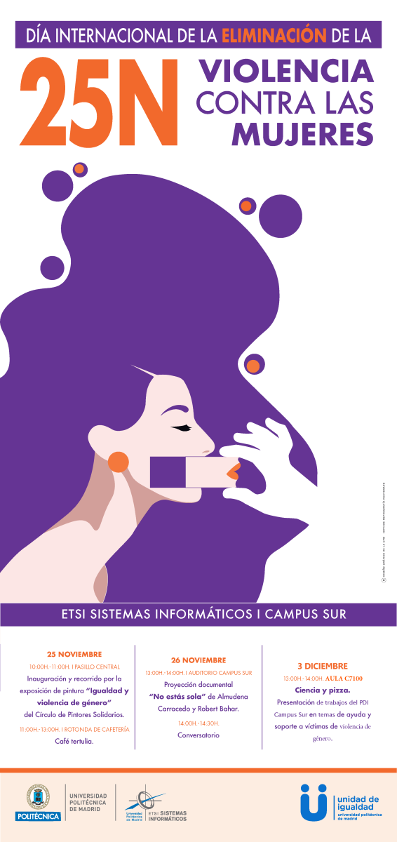 Con motivo del Día Internacional para la Eliminación de la Violencia contra las Mujeres, la Unidad de Igualdad y Diversidad de la UPM en colaboración con nuestra Escuela, os invita cordialmente a participar en una serie de eventos que darán comienzo el próximo lunes 25 de noviembre. Con estos eventos, buscamos fomentar la sensibilización, concienciación y educación sobre las acciones necesarias para erradicar las diversas formas de violencia de género, que lamentablemente aún persisten en nuestra sociedad.